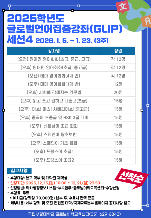 | [홍보] 2025학년도 글로벌 언어집중강좌(GLIP) 세션 4 운영 안내 | |||