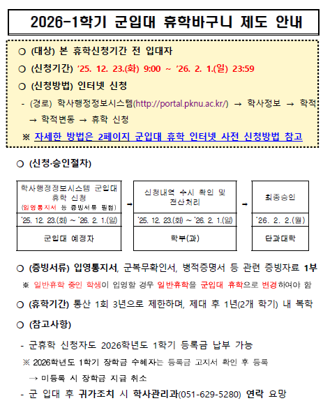 2026학년도 1학기 군입대 휴학바구니(사전휴학) 신청 안내