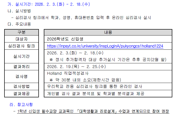 신입생 적성탐색검사 온라인 실시 안내