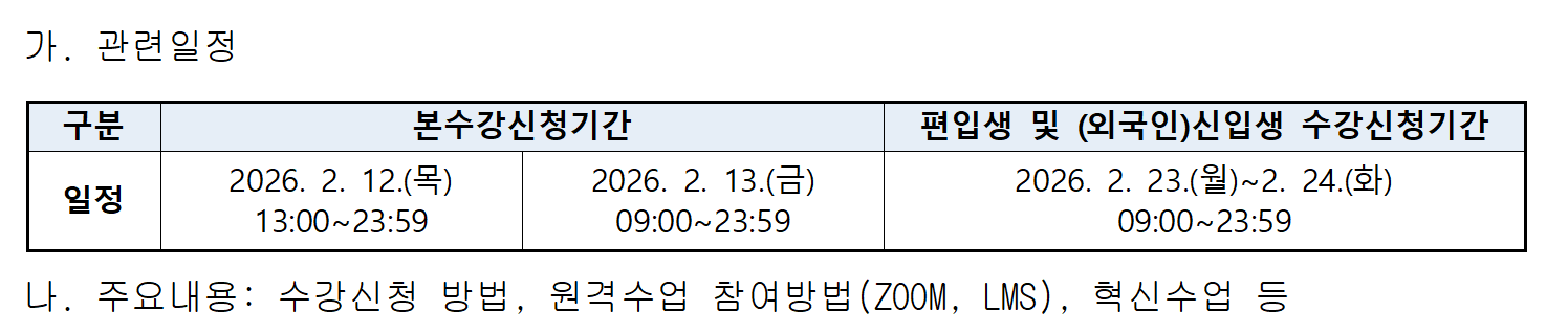 | 첨부파일 | 1. 신입생 수강신청 메뉴얼(2026-1).pdf 2. LMS 사용 설명서.pdf 3. 실시간강의 수강방법.pdf 4. 혁신수업 안내자료(2026).pdf | ||