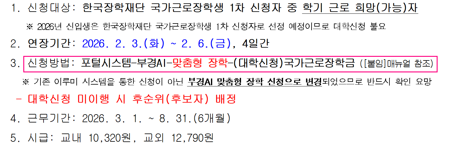 2026학년도 1학기 국가근로장학금 대학신청 기간 연장 안내