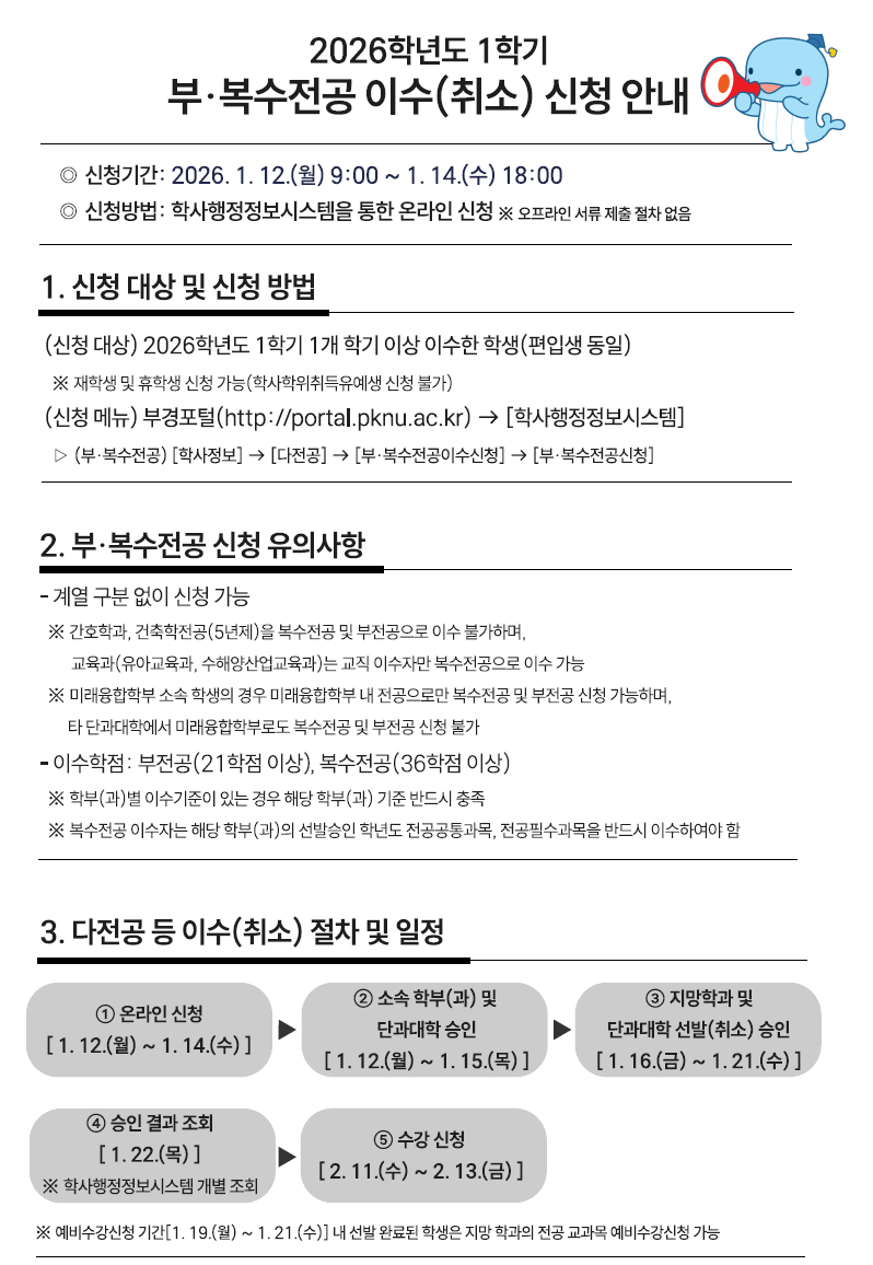 | 첨부파일 | (붙임1)2026-1학기 부·복수전공 이수(취소) 신청 안내문.pdf (붙임2)2026학년도 부전공 및 복수전공 선발기준(예외선발기준).xlsx (붙임3)다전공-학사행정정보시스템 사용설명서.hwp (붙임4)다전공(융합, 학생설계) 및 마이크로전공 편성 목록_2025.12월 기준.xlsx (붙임5)2026-1학기 마이크로전공 이수(취소) 신청 안내.pdf | ||