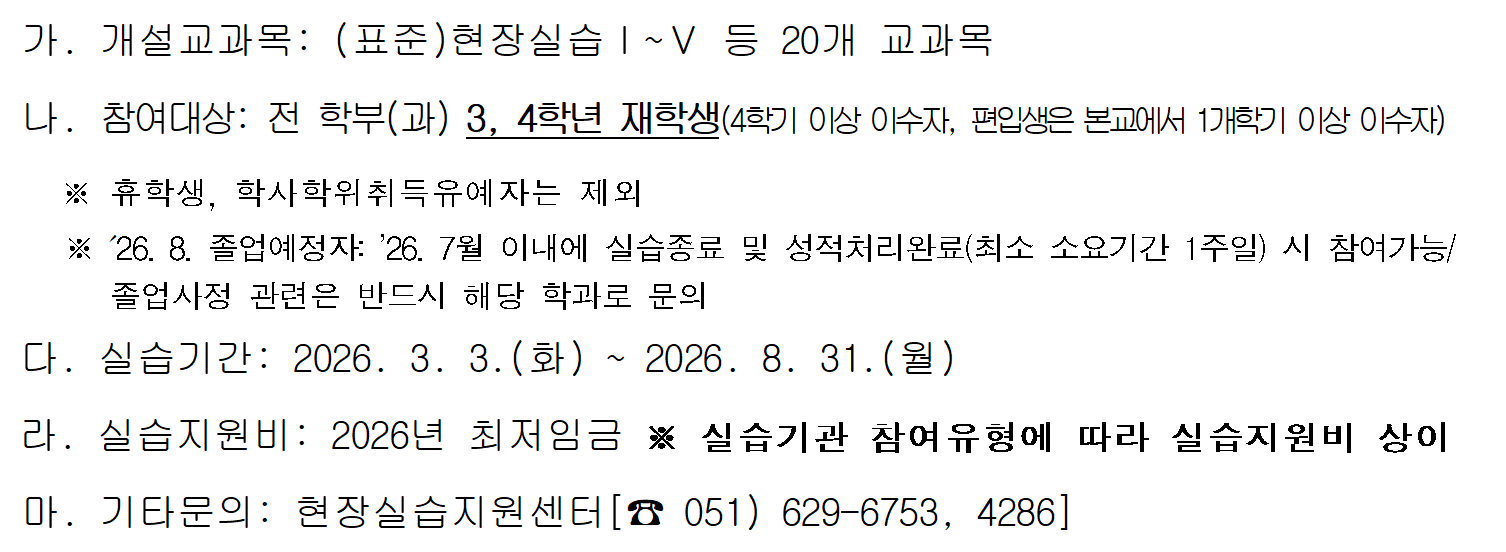 2026학년도 1학기 현장실습학기제 참여 실습생 모집 안내