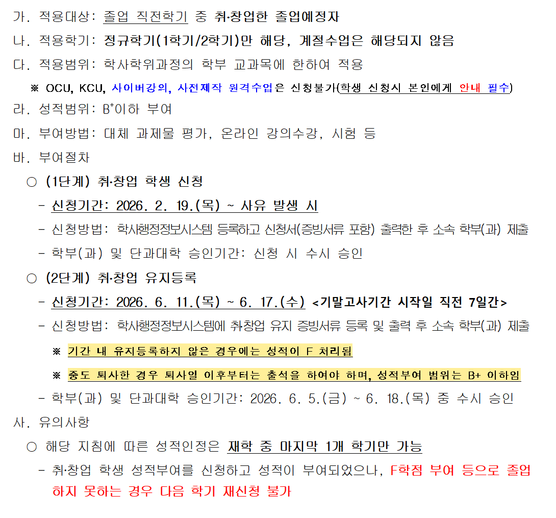 2026학년도 1학기 취창업 학생 성적부여 신청 및 유지등록 안내