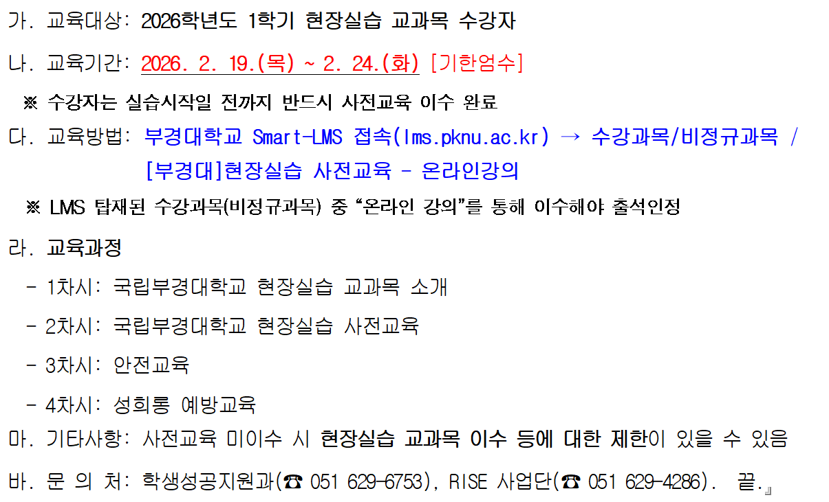 2026학년도 1학기 현장실습 사전교육 의무수강 안내