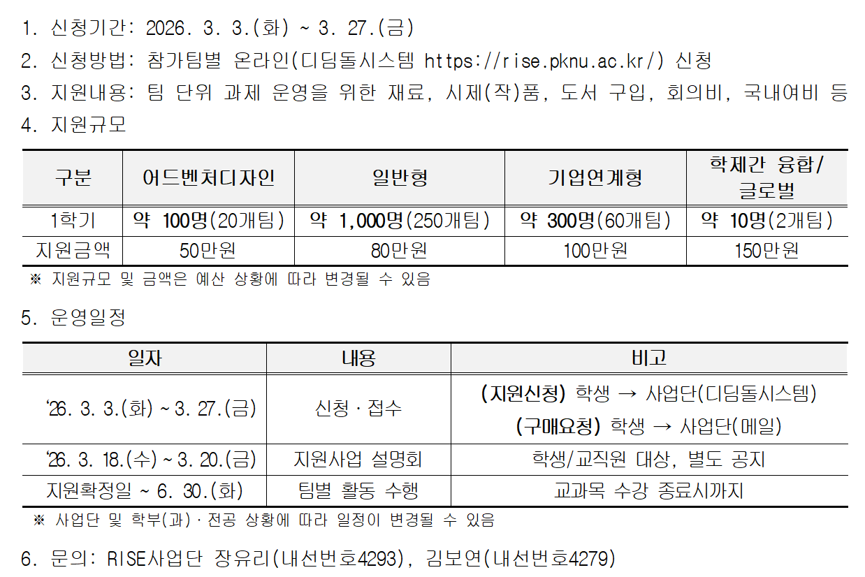 | 첨부파일 | (붙임1)2026학년도 RISE 캡스톤어드벤처디자인 지원사업 계획(안).pdf (붙임2)2026학년도 1학기 RISE 캡스톤어드벤처디자인 지원사업 매뉴얼.pdf (붙임3)2026학년도 1학기 기업연계형 캡스톤디자인 주제 현황.xlsx (붙임4)구매요청서_팀명,팀장명.hwpx (붙임5)수령확인서_팀명,팀장명.hwp | ||