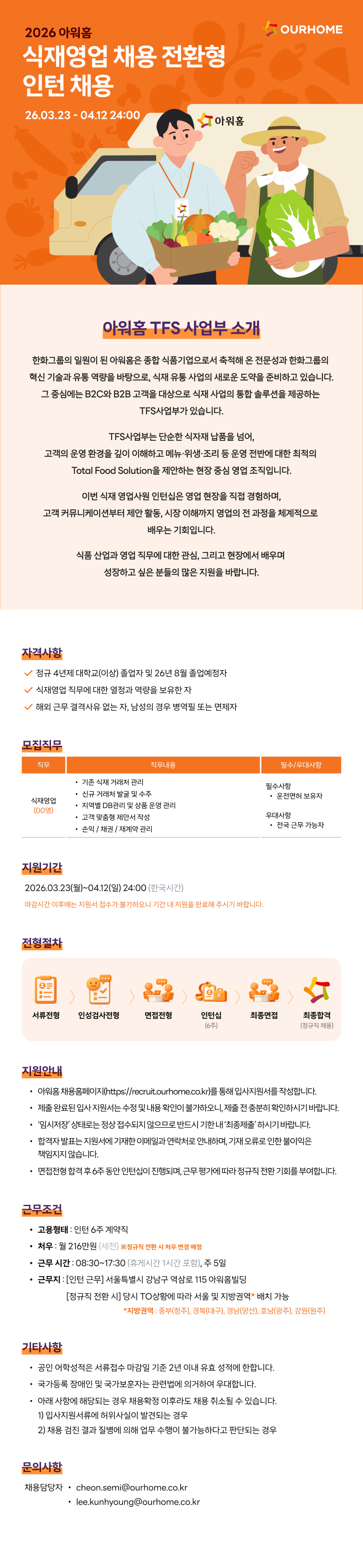 [채용] 2026 아워홈 식재영업 채용 전환형 인턴 채용