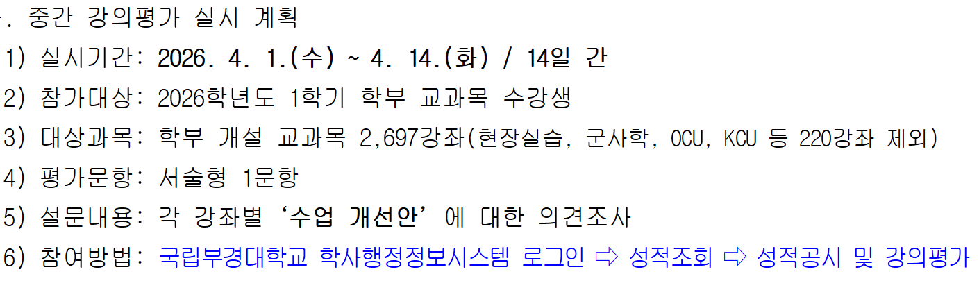 2026학년도 1학기 중간 강의평가 실시 계획 안내